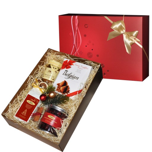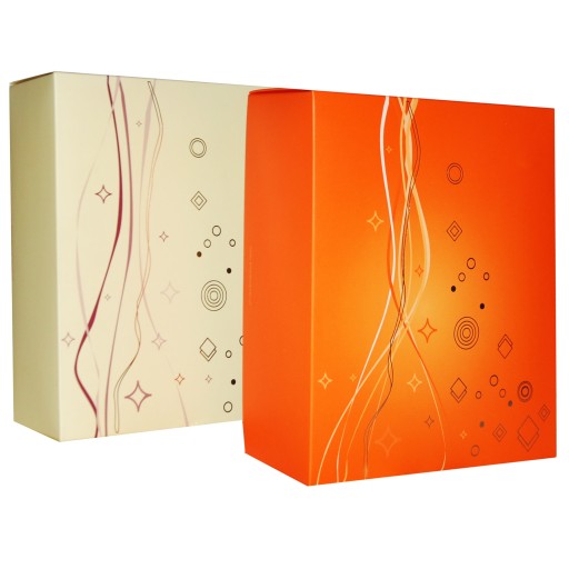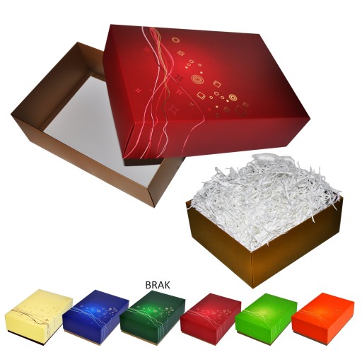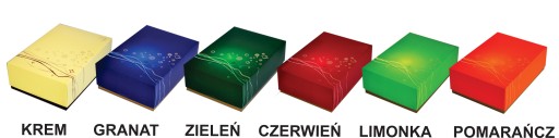 Pudełko prezentowe wykonane z białego, grubego kartonu, wierzch w kolorze do wyboru: mocnego granatu, czerwieni, pomarańczu, zieleni, limonki i kremu, z dekoracjami wykonanymi złotą folią. Spód pudełka w kolorze złotym. Przy pudełkach kremowych - spód jest w kolorze bordo.