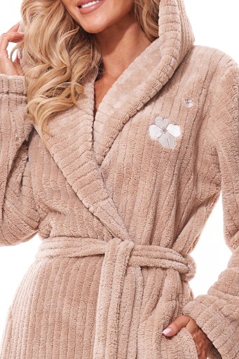 Ciepły szlafrok damski z dzianiny soft w prążki. Szlafrok w kolorze beżowym. Model z długim rękawem, wiązany w pasie, długość do połowy łydki. Na wysokości piersi niewielki haft. Po bokach kieszenie. Szlafrok damski z kapturem. Przyjemny i bardzo wygodny.