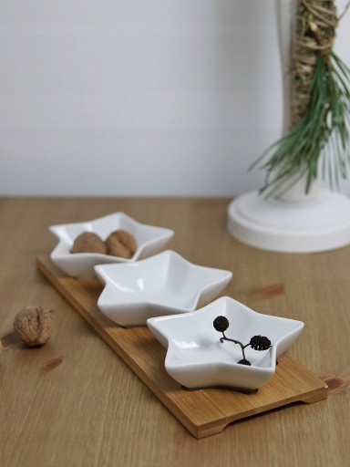 Zestaw trzech miseczek w kształcie gwiazdek na podstawie z bambusa to wyjątkowy dodatek do zastawy stołowej. Ich prosty, a zarazem nowoczesny design idealnie współgra z innymi elementami zastawy, dodając jednocześnie uroku i oryginalności.