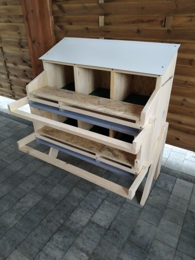 Drewniane, automatyczne gniazdo dla kur niosek.