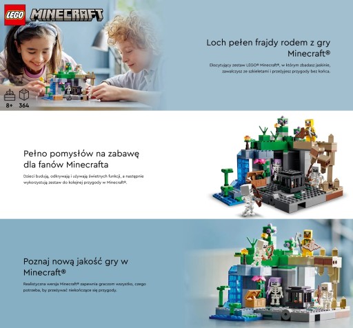 ▶️Z LEGO Minecraft Loch Szkieletów, dzieci mogą przeżyć swoje ulubione przygody z gry w świecie klocków. Znajdą w nim kultowe elementy, takie jak: