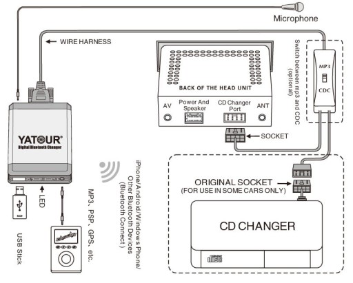 Fabrycznie nowy zestaw/zmieniarka głośnomówiący firmy Yatour , umożliwia podłaczenie pod firmowy odtwarzacz w miejsce standartowej zmieniarki , prowadzenie rozmów telefonicznych i przesyłanie muzyki przez bluetooth (protokół A2DP) , z dowolnego urządzenia , telefon , laptop, tablet itd. ,