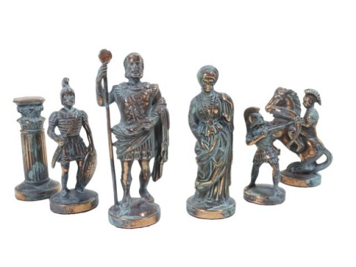 Szachy inspirowane elementami mitologii greckiej - piony to łucznicy, król i hetman - bogowie greccy, goniec- rycerz w rynsztunku, skoczek - jeździec, wieża - kolumna grecka.