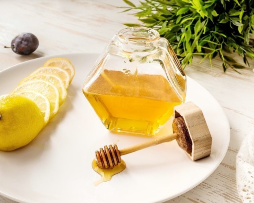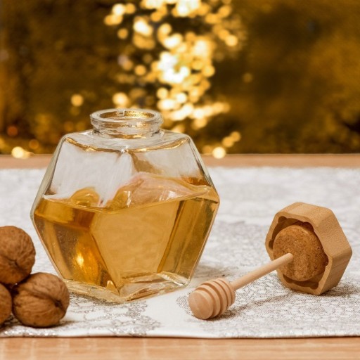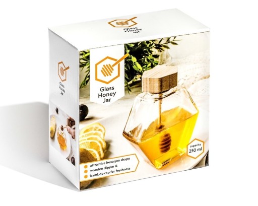 Ozdobny szklany słoiczek na miód w sześciokątnym kształcie przywodzącym na myśl plaster miodu ze specjalną drewnianą łyżeczką do nakładania miodu. Łyżeczka umieszczona jest w drewnianej nakrętce z korkową uszczelką, by zadbać o świeżość miodu.