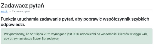 Zadawacz pytań w połączeniu z autoresponderem AleAsystent pozwoli Ci w sposób zautomatyzowany na podwyższenie współczynnika terminowych odpowiedzi i w efekcie utrzymania statusu SuperSprzedawcy.