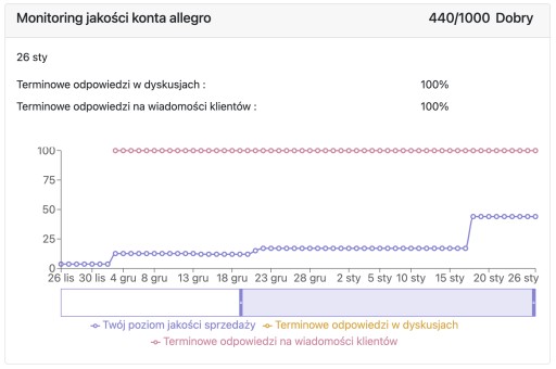 Monitoring jakości konta allegro wskazuje terminowe odpowiedzi oraz Twoją ocenę jakości konta Allegro. Prosty wykres, obrazuje jak na przestrzeni dni, zmieniają się dane. Szybki rzut okiem pozwoli Ci na weryfikację, którą z wartości powinieneś podnieść.