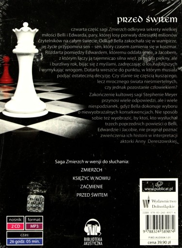 Czwarty i najbardziej wyczekiwany tom cyklu Zmierzch, odkrywa sekrety wielkiej miłości Belli i Edwarda, pary, której losy porwały dziesiątki milionów czytelników na całym świecie. Odkąd Bella zakochała się w wampirze, jej życie przypomina sen - sen, który czasem zamienia się w koszmar. Rozdarta pomiędzy Edwardem, któremu oddała serce, a Jacobem, z którym łączy ją tajemniczo silna więź, przeżyła piękny, ale i burzliwy rok, bijąc się z myślami, zadręczając o los najbliższych i wymykając wrogom. Dotarła wreszcie do punktu, w którym musiała podjąć ostateczną decyzję. Czy stanie się częścią kuszącego, lecz mrocznego świata nieśmiertelnych, czy jednak pozostanie człowiekiem? Zakończenie kultowej sagi Stephenie Meyer przynosi wiele odpowiedzi, ale i wiele niespodzianek, gdyż Bella dokonuje wyboru o niewyobrażalnych konsekwencjach. Nie sposób sobie też wyobrazić, by ktoś, kto wysłuchał trzech poprzednich powieści o Belli, Edwardzie i Jacobie, nie pragnął poznać zwieńczenia ich historii w interpretacji aktorki Anny Dereszowskiej.