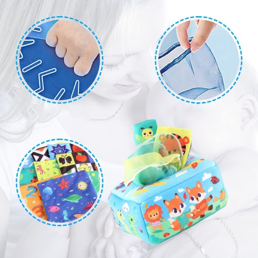 【Bez chusteczek siatkowych】 Zabawki sensoryczne dla dzieci mogą zastąpić prawdziwe chusteczki, skutecznie zapobiegać gryzieniu chusteczek przez dziecko, a nawet przedostawaniu się chusteczek do żołądka, mogą także utrzymać czystość i porządek w domu. Pudełko na chusteczki dla niemowląt w wieku 0–36 miesięcy jest łatwe w użyciu, a dziecko może z łatwością wyciągać marszczony papier i szaliki.