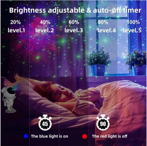 Ten projektor świeci z 8 kolorami mgławicy, 4 poziomami jasności, 2 trybami pracy (mgławica z gwiazdami lub bez gwiazd). Galaktyka w świetle gwiazd jest wyświetlana na ścianach i suficie w wysokiej rozdzielczości, dzięki czemu poczujesz się jak w ogromnej galaktyce.