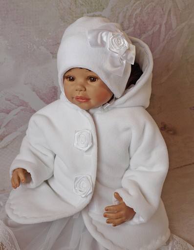 Płaszczyk został uszyty z mięciutkiego białego polarku, podszyty od spodu bawełnianą pikówką z warstwą ociepliny. Ubranko zapinane jest na rzepy, posiada kaptur chroniący przed wiatrem ozdobione kokardką w zestawie znajduje się również wiązana czapeczka z taką samą ozdobą:)