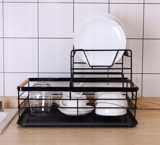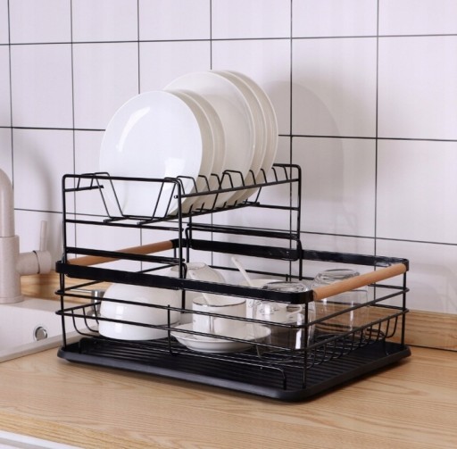 Suszarka do naczyń charakteryzuje się bardzo wysoką jakość i trwałą i metalową konstrukcją. Wykonana z żywicy tacka chroni blat przed zamoczeniem. W zestawie znajduje się również plastikowy, dwukomorowy ociekacz na sztućce. Metalowa czarna suszarka z drewnianymi rączkami jest eleganckim rozwiązaniem do każdej kuchni.