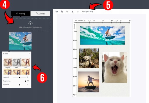 6️⃣ (6) - Na zdjęcie lub grafikę które załadujesz możesz dodatkowo nałożyć filtry, możesz sprawić w jednej sekundzie, że zdjęcie kolorowe stanie się czarno-białe lub nałożysz dodatkowe filtry, zmienisz jasność, kontrast