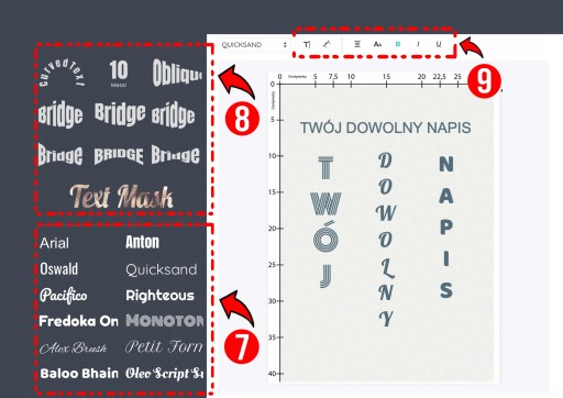7️⃣ (7) - Wybierzesz jedną z wielu dostępnych czcionek (krojów pisma), umieścisz dowolny tekst
