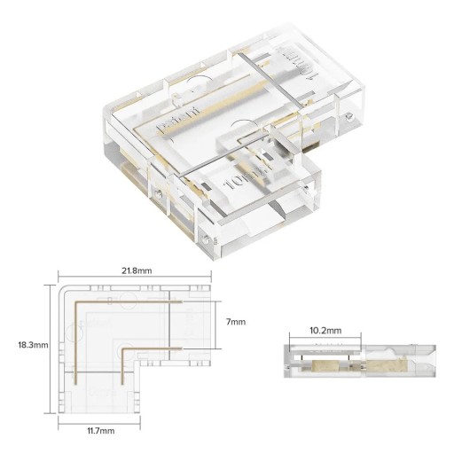 Złączka kątowa typ L dedykowana do taśm COB 2-pinowych o szerokości 10mm pozwala w łatwy sposób połączyć dwa odcinki taśm LED tworząc kąt prosty.