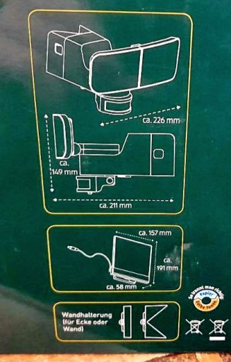 Reflektor można ustawić poziomo, pionowo, w lewo i w prawo w celu uzyskania optymalnego oświetlenia. Czujnik ruchu można również obracać w dół, w prawo i w lewo. Czas świecenia można ustawić w zakresie od 10 do 60 sekund. Posiada obudowę ochronną o stopniu ochrony IP44.
