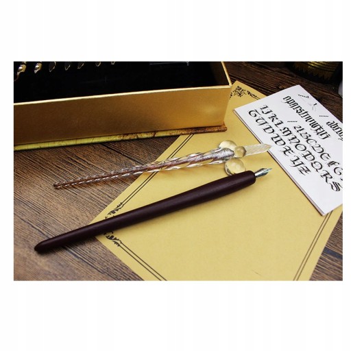- 2 pióra jedno drewniane, którego drewniana obsadka na stalówki posiada ergonomiczny kształt, dzięki któremu wygodnie leży w dłoni, drugie szklane o pięknych kształtach.