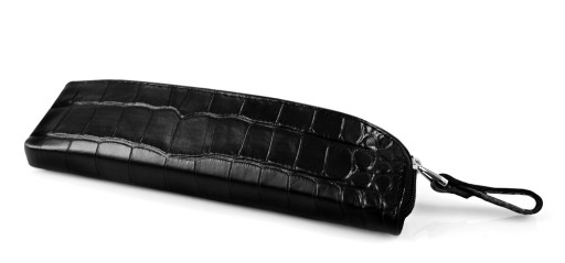 Elegancki piórnik skórzany uszyty ze skóry naturalnej imitującej skórę krokodyla. Piórnik zamykany na suwak, doskonale zastąpi małą kosmetyczkę. Dostępny w kolorze czarnym.
