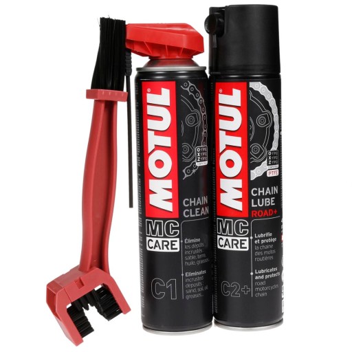 Zestaw do pielęgnacji i konserwacji Motul. Zestaw składa się z białego smaru do wszystkich typów łańcuchów motocyklowych w sprayu firmy Motul C2+ o pojemności 400ml, środka do wszystkich typów łańcuchów z aktywnymi rozpuszczalnikami firmy Motul C1 o pojemności 400ml oraz szczotki do czyszczenia łańcuchów motocyklowych z bardzo wytrzymałym oraz twardym włosiem.