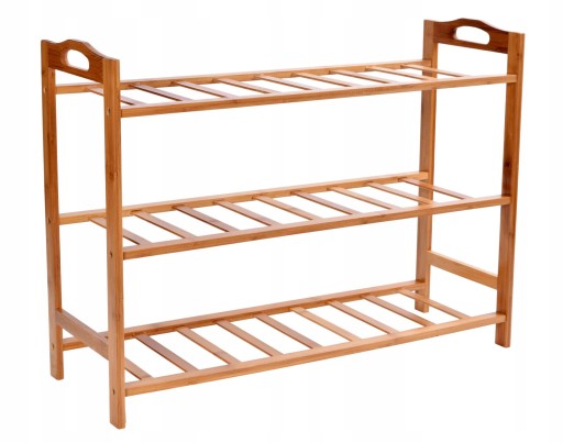 Trzypoziomowy regał na buty, wykonany z lakierowanego drewna bambusowego.