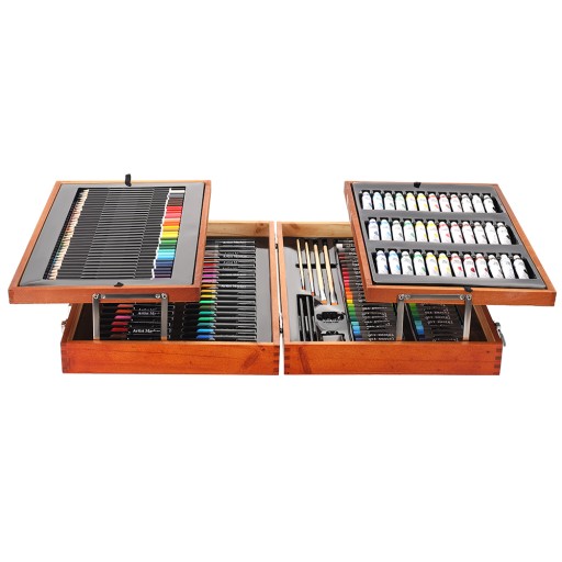 Całość umieszczona jest w eleganckiej, rozkładanej, dwupoziomowej, drewnianej walizce co niewątpliwie podwyższa jej walory estetyczne, jak również wpływa na trwałość. Walizka posiada wytrzymałą, skórzaną i wygodną rączkę, dzięki czemu transportowanie pełnej zawartości jest proste i komfortowe, a także zwiększa satysfakcję z użytkowania. Metalowe, mocne klamry gwarantują, że podczas przenoszenia walizka będzie szczelnie zamknięta i żadna rzecz się z niej nie wysypie ani niczego nie zgubimy. Osobne przegródki dają łatwy i szybki dostęp do potrzebnych rzeczy, a także zapewniają ich ochronę oraz utrzymanie porządku w walizce. Bez kłopotu zabierzemy ją ze sobą, np. na uczelnię, w plener czy też na prywatne zajęcia.