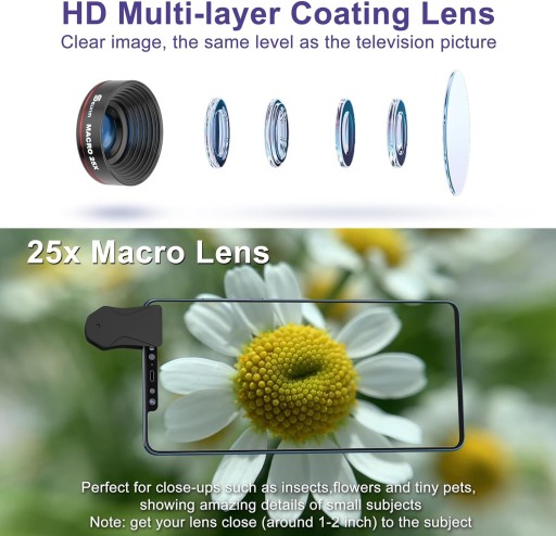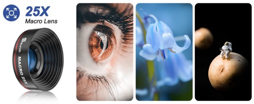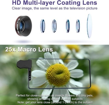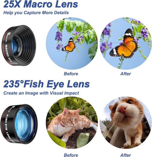 - 【Wzbogać funkcje fotografowania telefonem komórkowym】 Obiektyw makro 25X - rób zbliżenia kwiatów, owadów i innych małych obiektów i odkrywaj cuda mikrokosmosu; Obiektyw typu rybie oko 235° do iPhone'a - twórz zabawne i niepowtarzalne okrągłe, tajemnicze zdjęcia. Superszerokokątny obiektyw HD 0,62X - Uchwyć szerokie pole widzenia praktycznie bez zniekształceń, a oszałamiająca perspektywa czyni zdjęcie atrakcyjniejszym