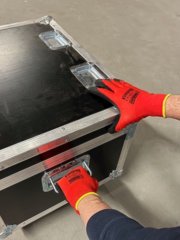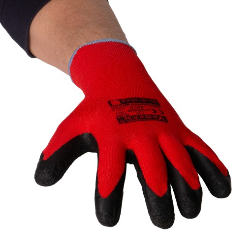 - Wytrzymałe rękawice ochronne wykonane z trwałej dzianiny poliestrowej, pokrytej warstwą lateksu i zakończone ściągaczem.