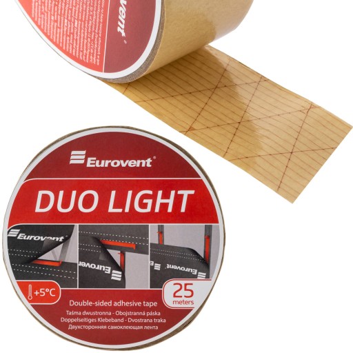 Dwustronna taśma DUO LIGHT Eurovent przeznaczona do sklejania membran oraz folii dachowych i paroizolacyjnych, a także innych produktów na bazie papieru, aluminium i tworzyw sztucznych stosowanych w budownictwie. Dzięki szerokości aż 50mm skleja idealnie zakłady folii i membran dachowych gwarantując szczelność na wiatr, wodę i wilgoć. W wewnętrznych zastosowaniach jest niezastąpiona podczas sklejania wszelkiego typu folii, oraz membran paroizolacyjnych, zapewniając odporność na przenikanie pary wodnej z wnętrza budynku do ścian i poddasza. Powszechnie stosowana podczas przyklejania produktów paroizolacyjnych do stelaży sufitów podwieszanych.