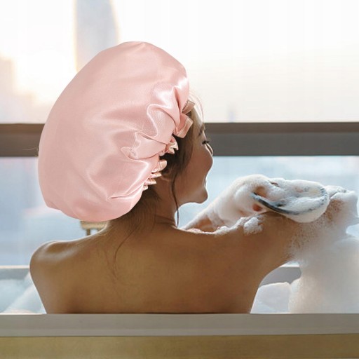 [Dwuwarstwowa konstrukcja]: dwuwarstwowy czepek kąpielowy, elegancka satynowa strona zewnętrzna i wodoodporna podszewka wewnętrzna, mogą skutecznie utrzymywać suche włosy podczas kąpieli pod prysznicem.