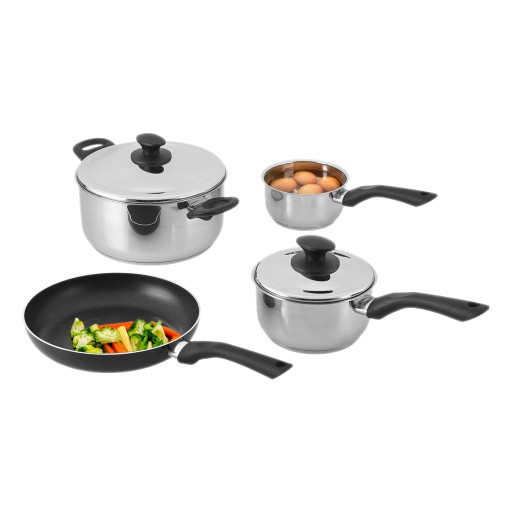 Kompletny zestaw garnków w atrakcyjnej cenie – idealny do pierwszego własnego mieszkania! Dzięki trzem garnkom i patelni gotowanie stanie się przyjemnością. Garnki są wykonane ze stali nierdzewnej, wyposażone w aluminiowe dno i uchwyty z bakelitu odporne na wysokie temperatury. Patelnia jest wykonana z aluminium, ma praktyczną, nieprzywieralną powłokę i wygodny, gumowy uchwyt.