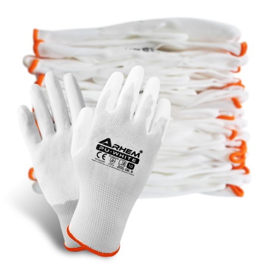 Rękawice robocze ochronne, wykonane z dzianiny poliestrowej w kolorze białym, powlekane poliuretanem w kolorze białym, bezszwowe, zakończone ściągaczem ARHEM PU-WHITE - 12 PAR