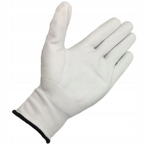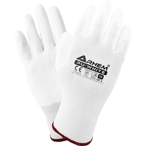 Rękawice robocze ochronne, wykonane z dzianiny poliestrowej w kolorze białym, powlekane poliuretanem w kolorze białym, bezszwowe, zakończone ściągaczem ARHEM PU-WHITE - 12 PAR