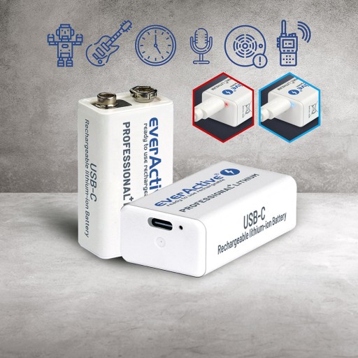 Akumulatory everActive o rozmiarze baterii 9V wykonane w technologii Li-ion naładujesz dowolną ładwarką USB-C - akumulator ma wbudowany kontroler, który zapewnia bezpieczny przebieg ładowania oraz dodatkowo elektronicznie zabezpiecza całą baterię podczas pracy.