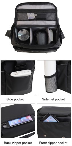 -2 kieszenie boczne pomieszczą większe akcesoria, filtry, ładowarki czy kable,