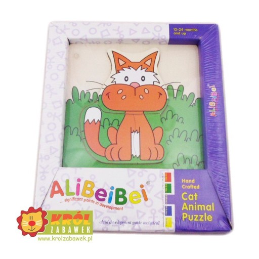 3 elementowe, drewniane puzzle z obrazkiem kotka.