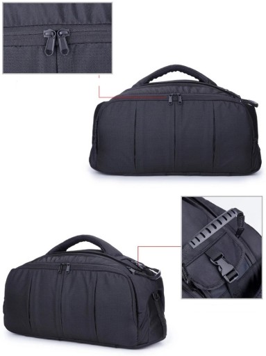 W komplecie znajduje się wygodny, regulowany pasek naramienny, z metalowymi klamrami, ułatwiającymi szybki montaż lub demontaż. Dla zapewnienia maksimum wygody torba została również wyposażona w 3 uchwyty do noszenia pokryte specjalną warstwą materiału antypoślizgowego. Pod spodem torby znajdują się specjalne uchwyty umożliwiające podpięcie statywu przy pomocy dołączonych do zestawu pasków mocujących.