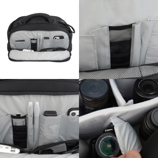 Komora główna, dzięki przestawialnym przegrodom, może być dowolnie konfigurowana i dzielona nawet na 6 części. Dowolna konfiguracja zapewnia optymalne wykorzystanie przestrzeni oraz perfekcyjne dopasowanie do sprzętu i potrzeb użytkownika. Torba pomieści korpusy, obiektywy, lampy błyskowe oraz szereg innych akcesoriów takich jak: aparat kompaktowy, kamera, filtry, ładowarki, piloty, akumulatory, czytniki itp. W kieszeni zewnętrznej znajduje się wiele przegródek i kieszeni aby zapewnić znakomitą organizację akcesoriów. Jest to doskonała opcja do przechowywania wszelkich drobiazgów typu karty pamięci, instrukcje, baterie, ładowarki, przewody itp. Tylnia dwufunkcyjna kieszeń. Po rozpięciu dolnego zamka można ją zamontować na rączce walizki.