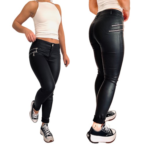 W822 CZARNE WOSKOWANE SPODNIE BIODRÓWKI NISKI STAN damskie eleganckie 38 M