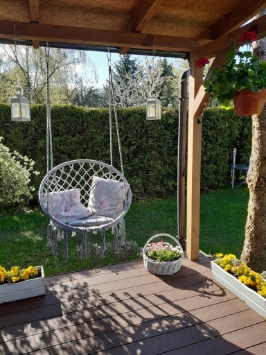 - UNIWERSALNA – produkt ma wiele zastosowań, możemy go powiesić na zewnątrz w ogrodzie, na balkonie, ale również wewnątrz – w salonie czy też w sypialni, huśtawka nada pokojowi nowoczesnego stylu; może być stosowana również w pokoiku dziecka, będzie przydatna dla wielu mam, które karmią swoje dziecko lub usypiają kołysząc w swych ramionach! W celu wydłużenia żywotności podczas niekorzystnych warunków atmosferycznych huśtawkę należy schować.