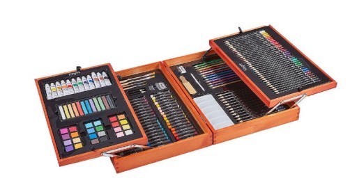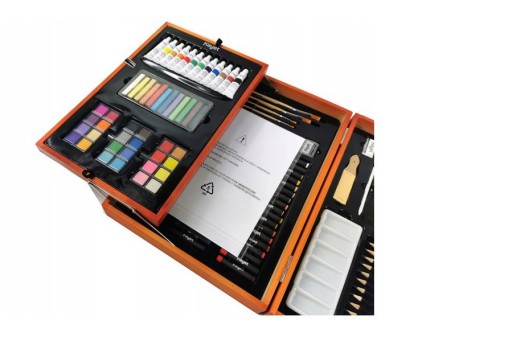 Zestaw artystyczny KAYET posiada stylową, drewnianą walizkę z rączką do przechowywania akcesoriów. Cały komplet jest bardzo duży, gdyż zawiera aż 180 różnorodnych elementów, zarówno do malowania jak i rysowania. W zestawie znajdziemy m.in. pastele olejne i suche, kredki ołówkowe, farby akrylowe w tubkach, farby akwarelowe w kostkach a także wiele innych akcesoriów. Wszystko zostało wykonane starannie i z dbałością o każdy szczegół. To świetny zestaw na początek artystycznej przygody.