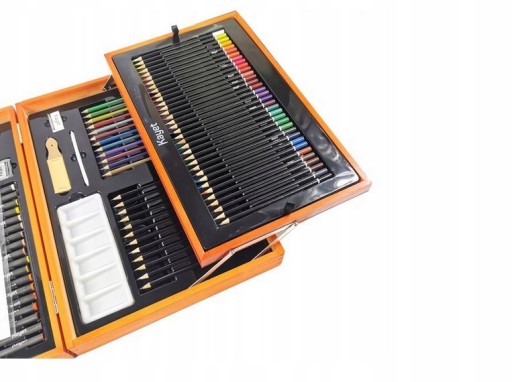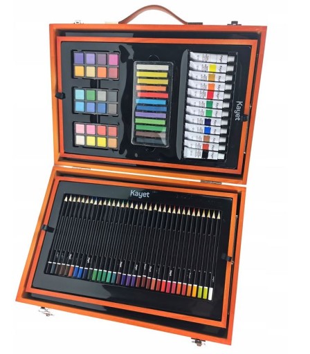 Zestaw artystyczny KAYET posiada stylową, drewnianą walizkę z rączką do przechowywania akcesoriów. Cały komplet jest bardzo duży, gdyż zawiera aż 180 różnorodnych elementów, zarówno do malowania jak i rysowania. W zestawie znajdziemy m.in. pastele olejne i suche, kredki ołówkowe, farby akrylowe w tubkach, farby akwarelowe w kostkach a także wiele innych akcesoriów. Wszystko zostało wykonane starannie i z dbałością o każdy szczegół. To świetny zestaw na początek artystycznej przygody.