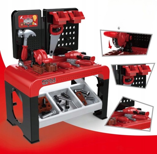 BOGATO WYPOSAŻONY WARSZTAT to świetny zestaw złożony z wielu elementów w dominującym kolorze czerwonym, solidne wykonany z dbałością o szczegóły. Dzięki niemu każdy może stać się profesjonalistą i ciąć, wiercić, skręcać i montować. Zestaw wyposażony został w wiele półek, szafek i wieszaków, na których można umieszczać narzędzia, a tym samym uczymy dziecko utrzymania porządku w miejscu zabawy i pracy. Dzięki tej zabawce Twoje dziecko zgłębi tajniki pracy w warsztacie i dodatkowo pozna do czego służą poszczególne narzędzia.