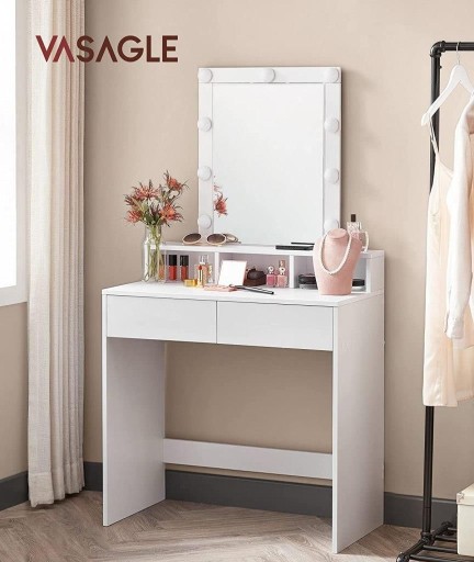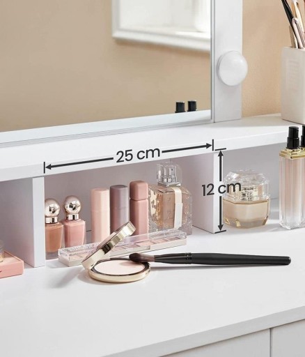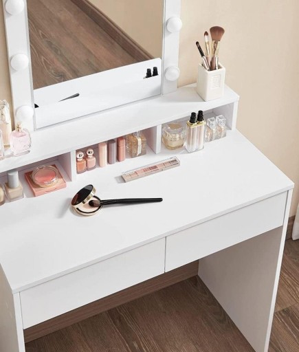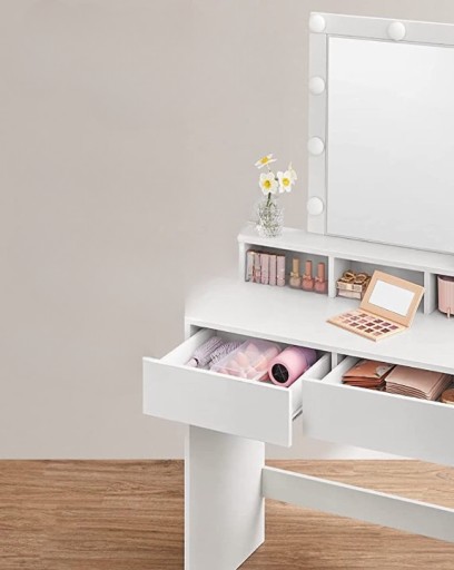 Ta stylowa i funkcjonalna toaletka z pewnością ułatwi codzienne przygotowania. Wyposażona w 9 regulowanych żarówek LED, zapewnia idealne oświetlenie do makijażu, eliminując problem rozmazanych kosmetyków. Dwie duże szuflady, trzy otwarte przegródki oraz podwyższona półka oferują mnóstwo miejsca do przechowywania cieni do powiek, pudru, lakierów do paznokci i perfum.
