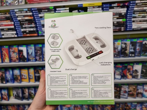 Aby użyć podstawki Froggiex należy podpiąć ją kablem, który znajduje się w zestawie do konsoli, w wyznaczonym miejscu. Następnie umieść pady na ładowarce, która pełni również funkcję stacji dokującej – po zakończeniu gry odłóż pady z powrotem w to miejsce i miej pewność, że są gotowe na kolejną rozgrywkę!