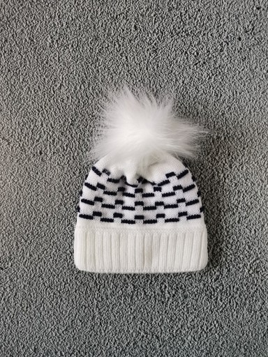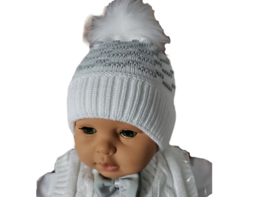 Wiązana jest pod szyją. Wzór w granatowe / lub szare przeszycia. Z slicznym pomponem z delikatnego futerka. Czapka jest rozciagliwa, poddaje sie i dopasowuje do glowki Malenstwa