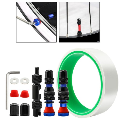 [Pakiet zawiera] 2 szt. wsporników do opon bezdętkowych 40 mm, 1 szt. taśmy do opon bezdętkowych, 1 szt. narzędzia do usuwania rdzenia, 1 szt. klucza sześciokątnego, 2 szt. uszczelki, 2 szt. nakładki na trzpienie i 2 szt. okrągłych gumowych podstaw.