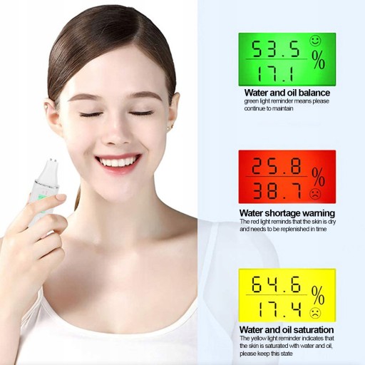 4. Inteligentne przypomnienie: Gdy zielone światło testera jest włączone, oznacza to, że należy kontynuować trzymanie. Gdy świeci się czerwone światło, oznacza to, że skóra jest sucha i należy ją uzupełnić na czas. Gdy świeci się żółte światło , oznacza to, że nawilżenie skóry i olej są nasycone, proszę zachować ten stan.