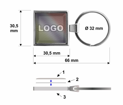 Graficzne logo na przedniej stronie breloczka wykonane technologią domingu. Nadruk grafiki wykonany na srebrnej folii metalizowanej [2], zalanej specjalnym polimerem o dużej przejrzystości i dużej odporności na zarysowania, matowienie, promienie słoneczne (UV) [1]. Całość wklejona na przedniej stronie breloczka [3].