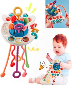 WIELOFUNKCYJNA ZABAWKA SENSORYCZNA - zabawka z powodzeniem może służyć jako gryzak, jak również przedmiot do treningu małych rączek. Wiele przycisków do naciskania, strun z różnymi końcówkami i różnym stopniem trudności w wyciąganiu, sprawiają, że przedmiot będzie cieszył przez długie godziny.