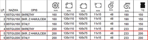 W skład kompletu wchodzą cztery koła mocowane na trzpień. Dwa koła są z hamulcem, o kodzie 7STGU200/37, w tabeli pod pozycją 5 oraz dwa koła stałe o kodzie 8STGU200/37, w tabeli pod pozycją 6.