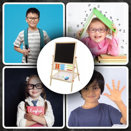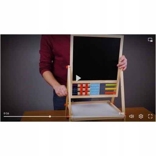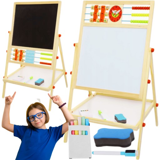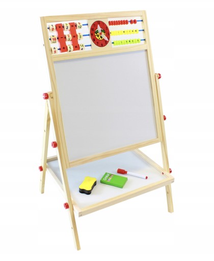 - 1 TABLICA = 6 FUNKCJI – tablica dwustronna to aż 6 różnych zastosowań. Umożliwia dziecku malowanie kredą po czarnej stronie tablicy oraz malowanie mazakiem po białej stronie. Tablica posiada także klasyczne liczydło z koralikami, z którym dziecko zacznie przygodę z liczeniem. Następnie może uczyć się podstawowych działań matematycznych, takich jak dodawanie, odejmowanie oraz mnożenie. Dziecko będzie miało również do czynienia z zegarem, na którym będzie mogło dowolnie ustawić czas za pomocą wskazówek; nauczy się rozpoznawania godziny. Na tablicy znajduje się również alfabet, który pozwoli dziecku zapoznać się z pierwszymi literami, co pozwoli później na tworzenie pierwszych wyrazów.